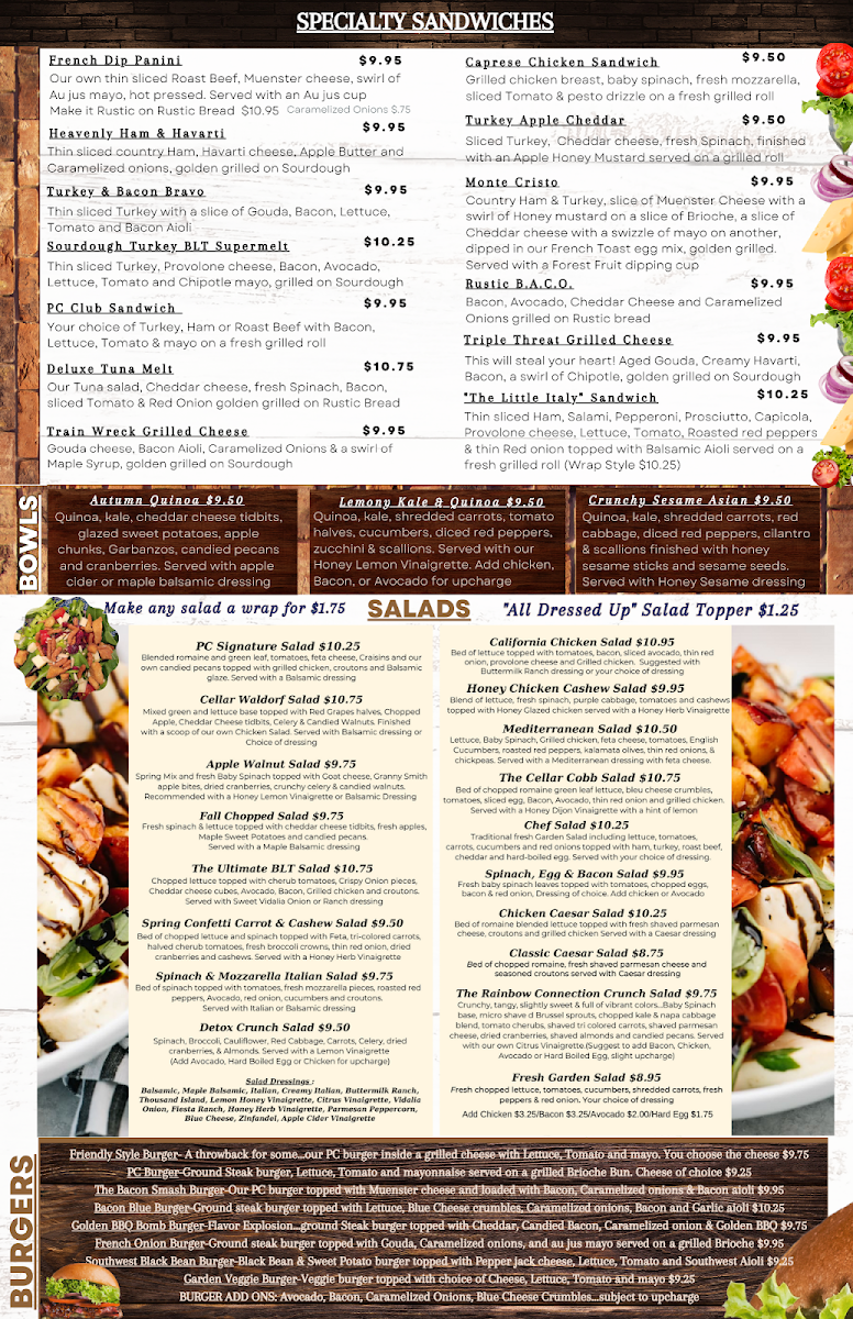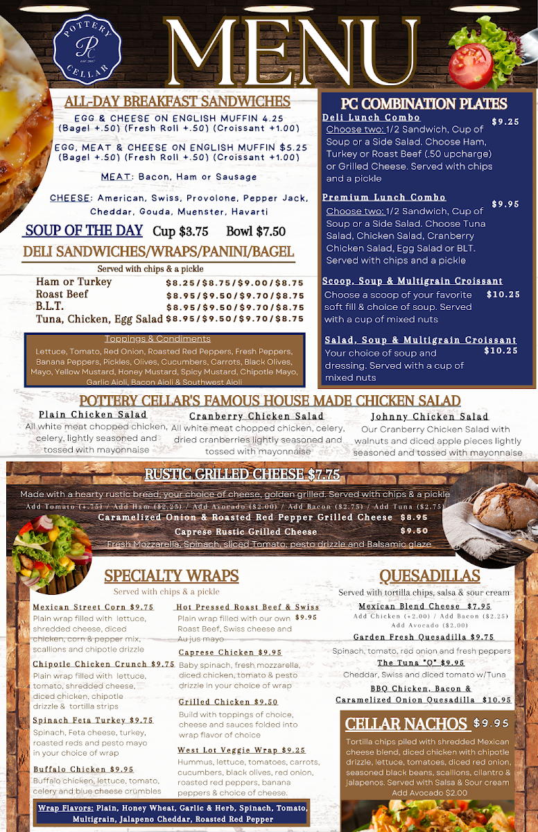 The Bubble Mug Cafe at Pottery Cellar offers a variety of cafe-style food and beverages suitable for breakfast, lunch, and casual coffee breaks. The menu features a selection of sandwiches, wraps, soups, salads, and quiches, as well as coffee and other drinks. Portions are generally generous, with options typically served alongside chips and pickles.